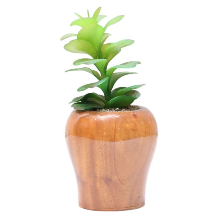 Natural wood pot: The warm tones and natural grain of the wooden pot complement the succulent, adding a rustic and organic touch.