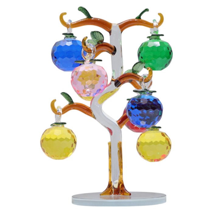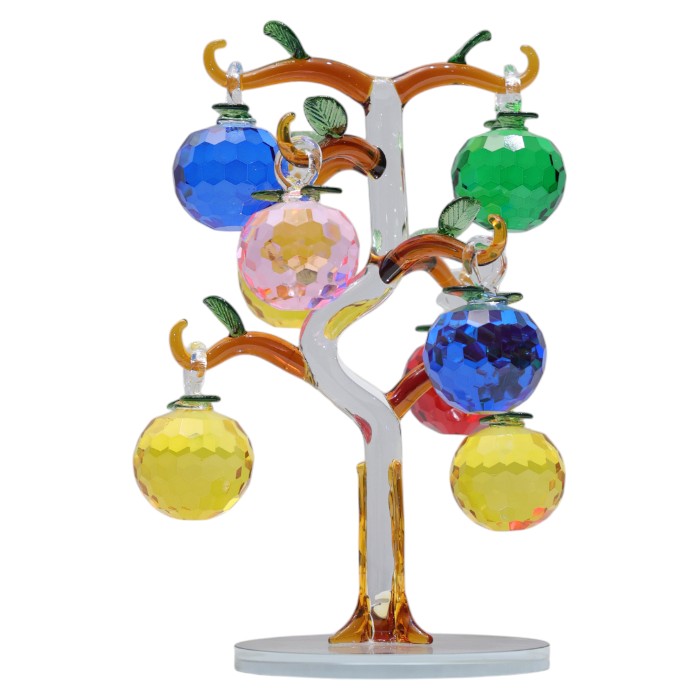 Handcrafted glass artistry: Notice the intricate details of the glass tree and the faceted crystal apples, showcasing the artisan's skill.
