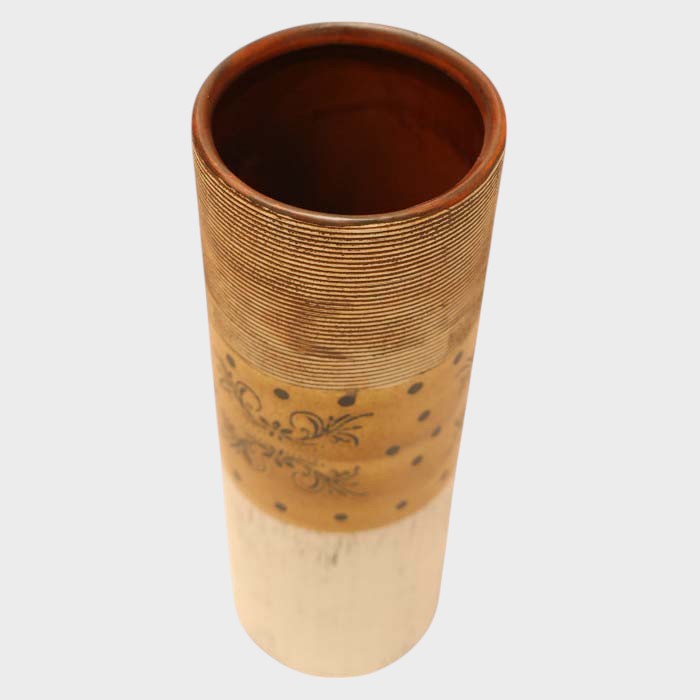 Enhance your decor with artisan charm: This cylindrical ceramic vase features a distinctive combination of patterns and textures, creating a unique and eye-catching decorative accent.
