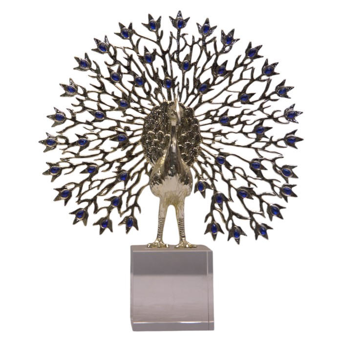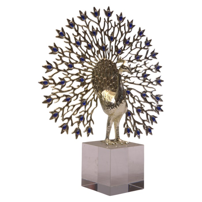 Add a touch of opulence to your home décor with this stunning peacock sculpture. The intricate design, featuring a fully displayed tail with delicate blue accents, creates a captivating focal point.