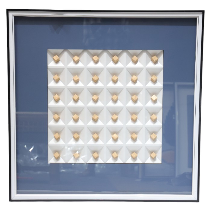 3D pyramid grid: The repeating pyramid shapes create a sense of depth and texture, adding a sculptural element to the artwork.