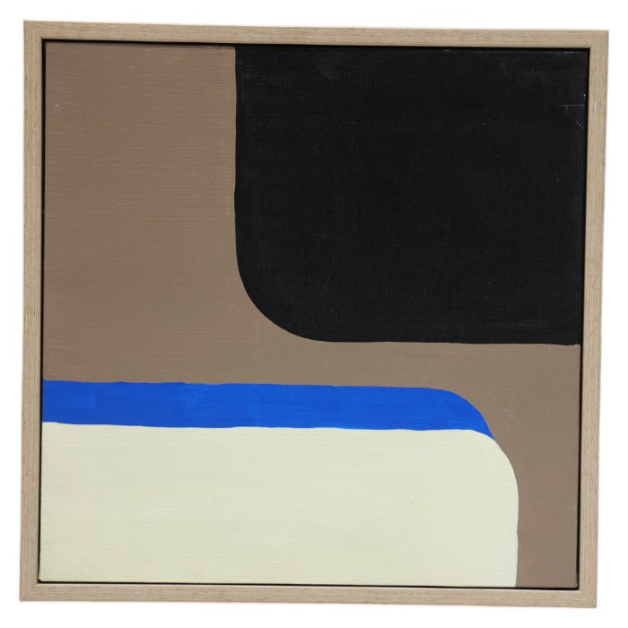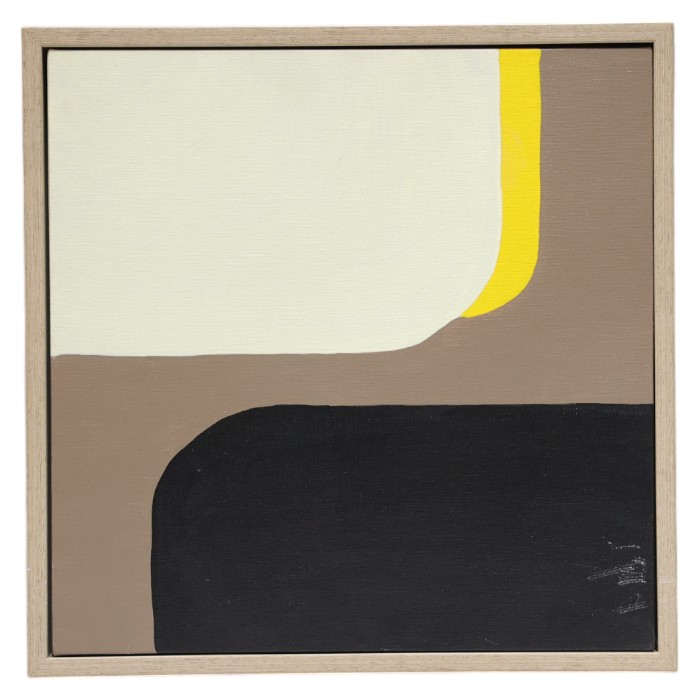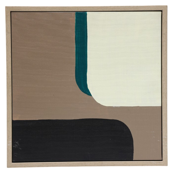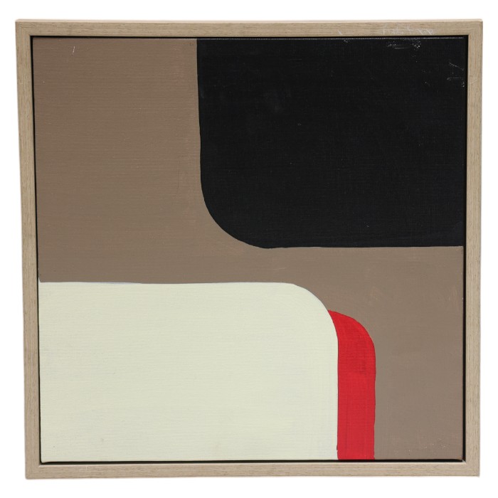 Make a sophisticated artistic statement: This framed abstract painting features bold geometric shapes and a neutral color palette, creating a visually compelling and modern piece.