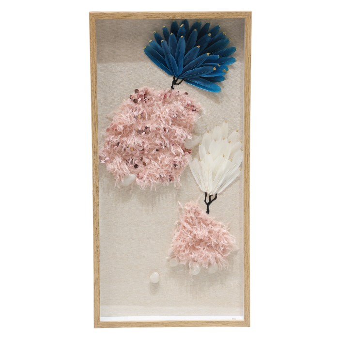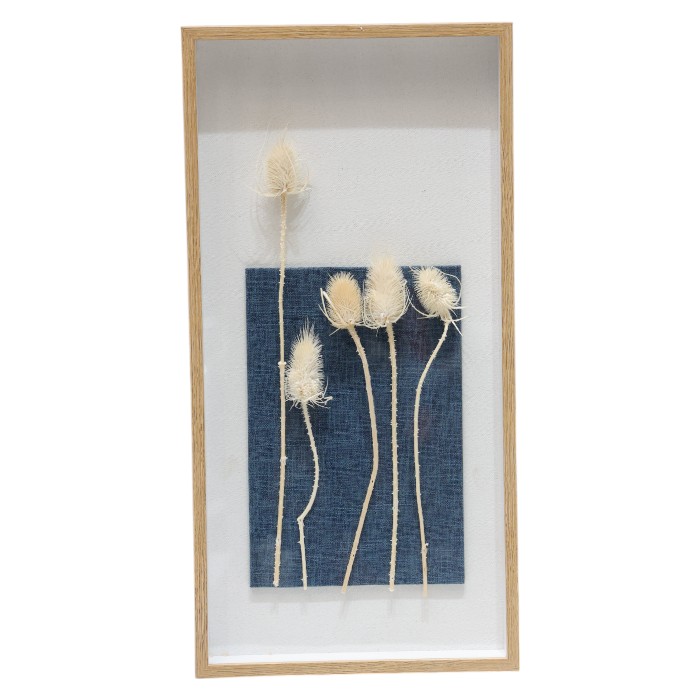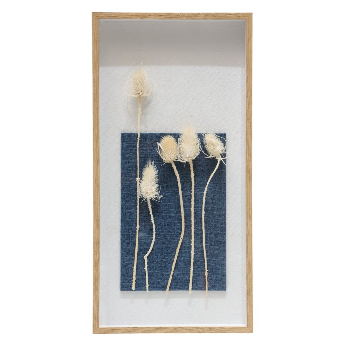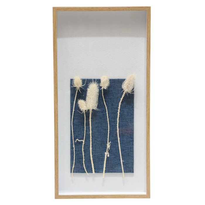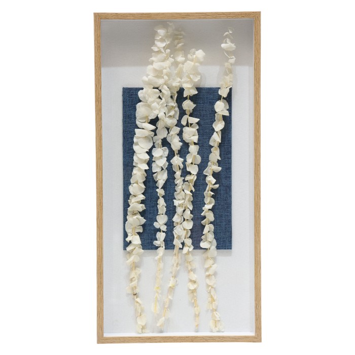 Bring delicate texture and modern elegance to your walls: This framed artwork features white paper strands arranged against a blue fabric background, creating a visually compelling and minimalist piece.