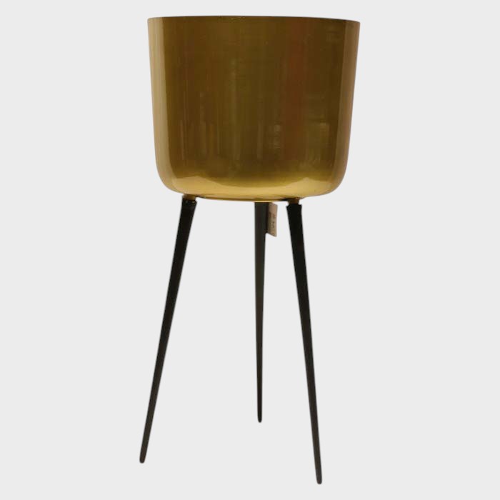 The planter is supported by a minimalist black metal tripod stand with slender, angled legs.