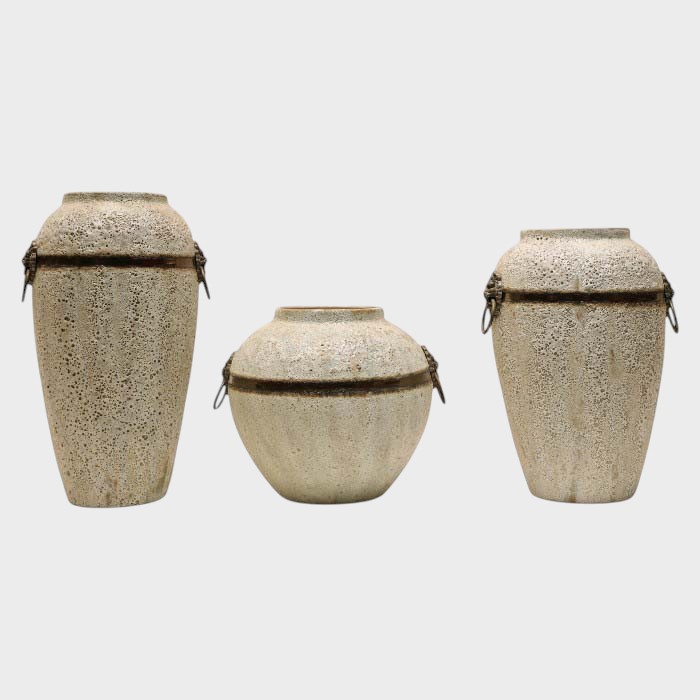 Textured Grey Ceramic Vase with Metal Rings - Rustic Elegant Decor (set of 3)